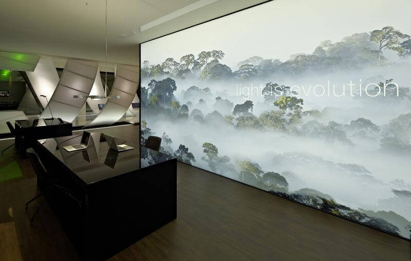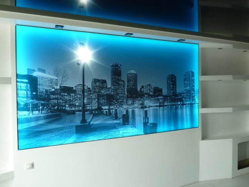 Oferujemy różne technologie produkcji i montażu ścian napinanych, oferujemy projekty stojaków firmowych do udziału w wystawach: klasyczna wersja to monofoniczna powłoka z logo firmy lub ściana ze wzorem i podświetleniem na obwodzie, lub wyjątkowa opcja - produkcja przy użyciu technologii DOUBLE VISION, która umożliwia zmianę projektu ściany artystycznej przy przełączaniu trybów światła.