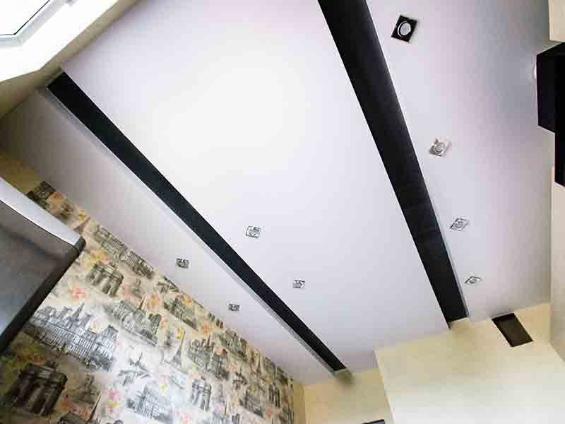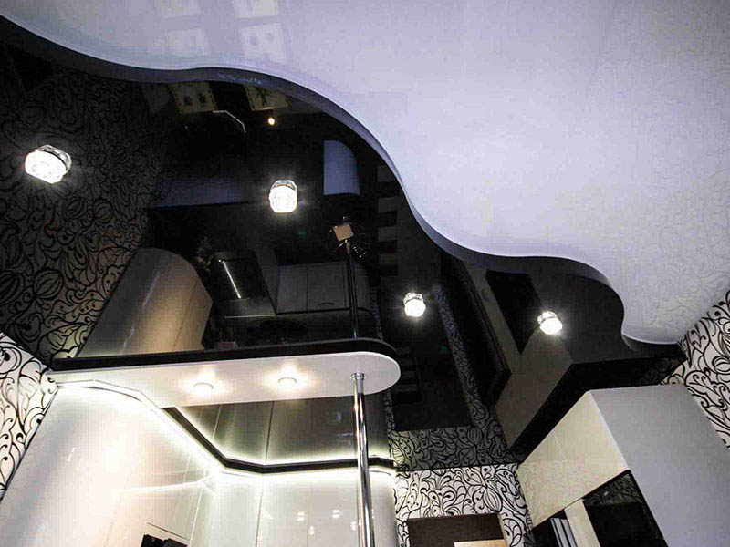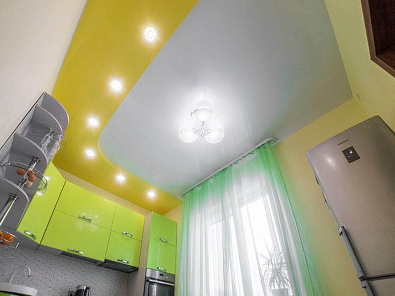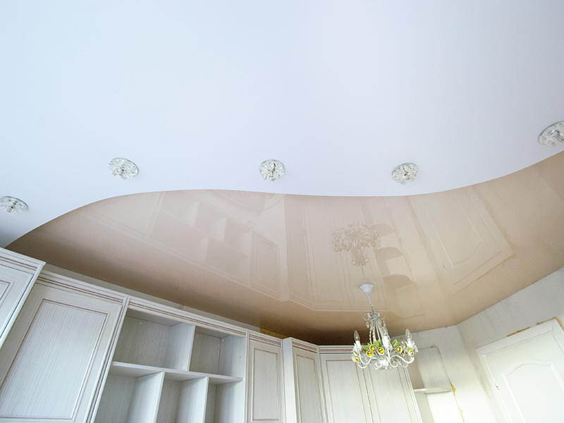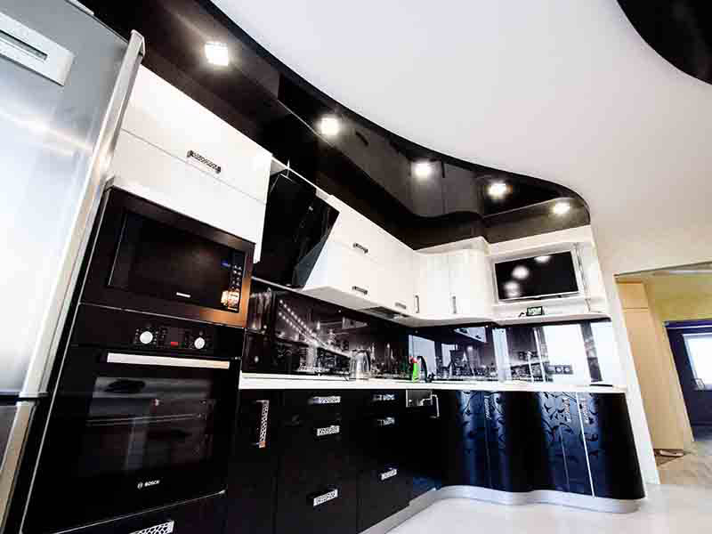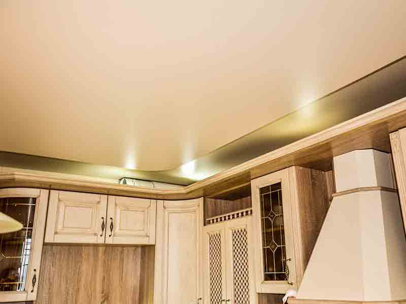 Najczęściej w kuchni są instalowane: sufity dwupoziomowe i sufity dwupoziomowe z oświetleniem, sufity z nadrukiem fotograficznym, sufity teksturowane, sufity świetlne, sufity napinane z pływającymi liniami, lakierowane i satynowe płotna.