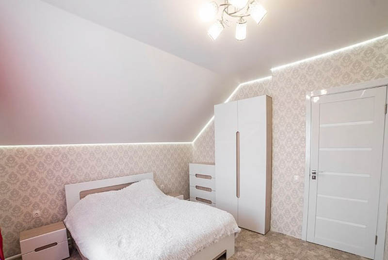 Najczęściej instalują się w sypialni: dwupoziomowe sufity i dwupoziomowe sufity z oświetleniem, pływające sufity napinane, sufity z nadrukiem fotograficznym, sufity satynowe i lakierowe, sufity „gwiaździste niebo” i Double vision.